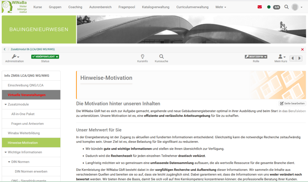 Der Zugang zum Seminarmodul LCA (Zusatzmodul06 LCA/QNG) kann von jedem auch separat gebucht werden!